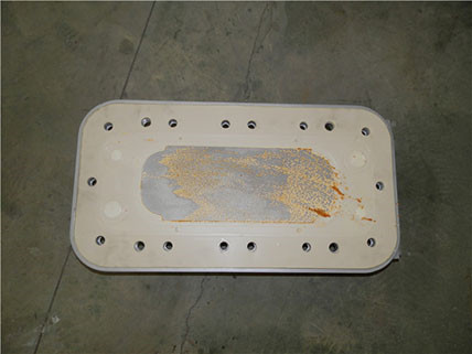 3. 拆卸后首先发现阳极端板局部腐蚀发黑。下图为阳极对应腐蚀位置的浓水室第一张阴膜的情况,发热烧灼迹象明显。浓水室隔板基本无变形,尚可。